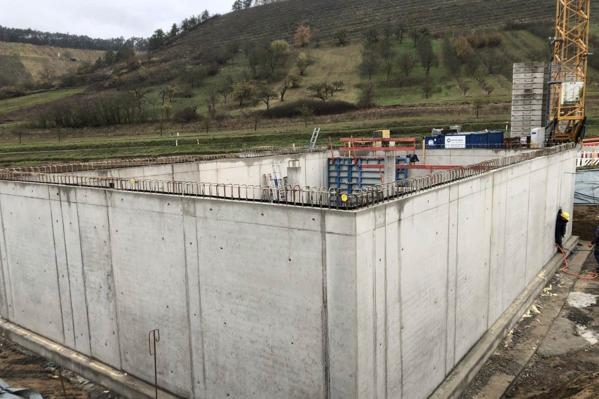 – Die Errichtung eines Regenüberlaufbeckens (RÜB) in Ortbetonbauweise mit ca. 460 m3 Nutzvolumen sowie der zugehörigen Maschinentechnik