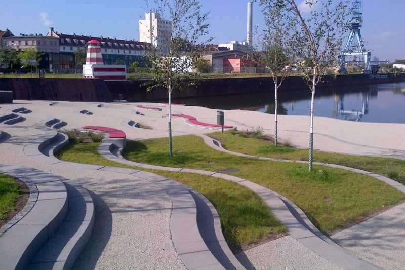 Mit dem Projekt Hafen Offenbach wird der früher industriell genutzte Hafen zu einem neuen Stadtteil entwickelt. Im Rahmen des Projektes entstehen auf der Hafenmeile und im Uferbereich komplett neue Wohn- und Gewerbequartiere. Der ausgeführte Bauabschnitt BA 1.3 beinhaltet die Endherstellung der Planstraße Hafeninsel sowie die landschaftstechnische Umgestaltung der Hafentreppe, Neugestaltung des Sonnenweges an der Hafenkante sowie die Endherstellung des Mainweges entlang des Mainufers.