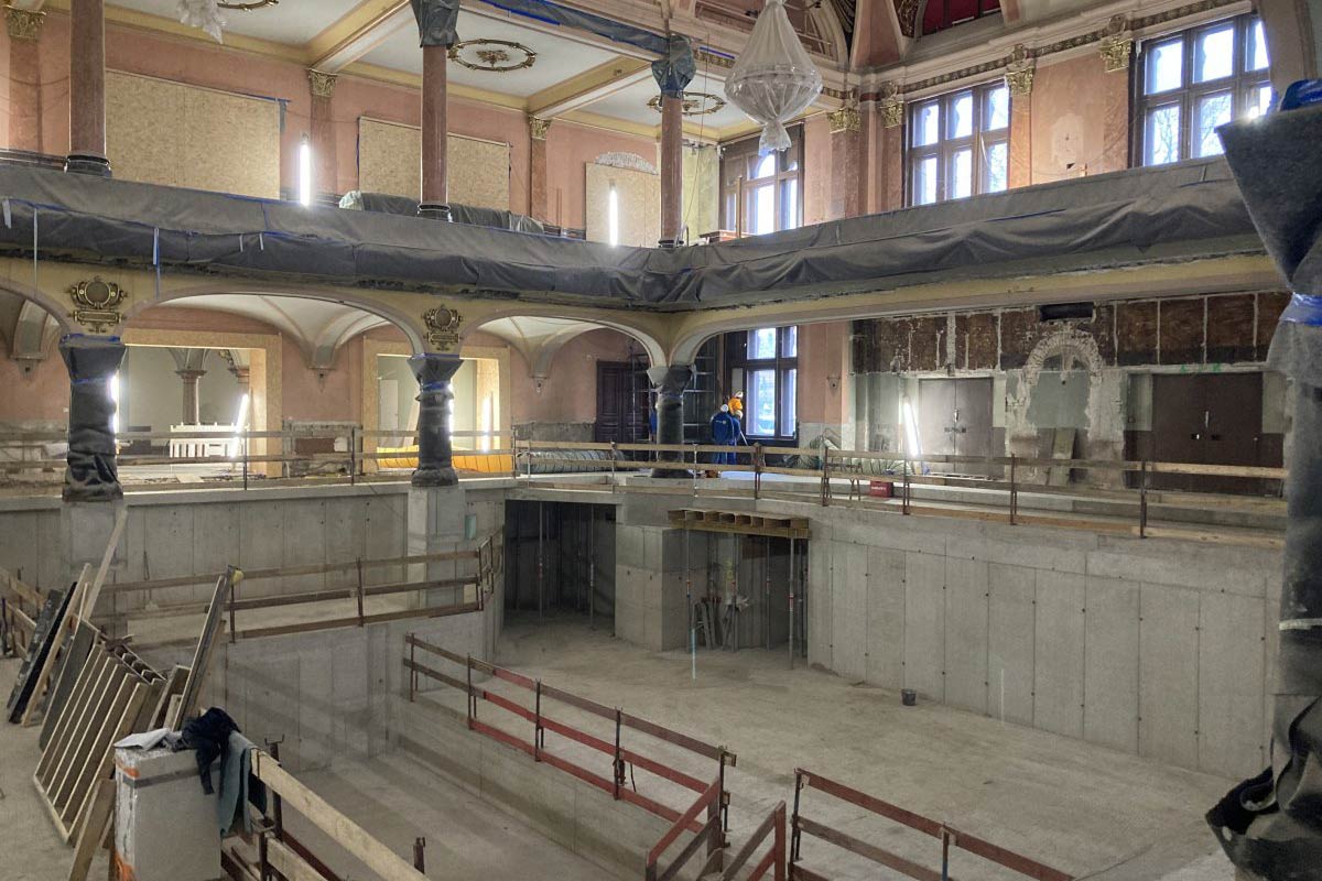 Das 1903 errichtete Gebäude, welches direkt am Neckar und in unmittelbarer Nähe zur historischen Altstadt von Heidelberg liegt, modernisiert und technisch auf neuesten Stand gebracht. Im Zuge der Instandsetzung wurden im Meriansaal vorhanden Gewölbedecken in größeren Umfang abgebrochen und durch StB-Decken ersetzt. Im „Großen Saal“ wurden die 6 tragenden Mittelstützen mittels einem liegenden Stahlfachwerk gesichert, vorhandene Decke im EG, Wände und BOPLA im UG komplett abgebrochen. Mit Fertigstellung des Erdaushubs im Gebäude wurde eine neue BOPLA, welche mittels Micropfählen rückverankert ist, in WU-Konstruktion zzgl. FBV-Folie erstellt. Anschließend wurde der Keller in diesem Bereich ebenfalls in WU-Beton-Konstruktion erstellt. Mit Fertigstellung der Sanierungsarbeiten soll das Gebäude als Konzert- und Kulturzentrum genutzt werden.