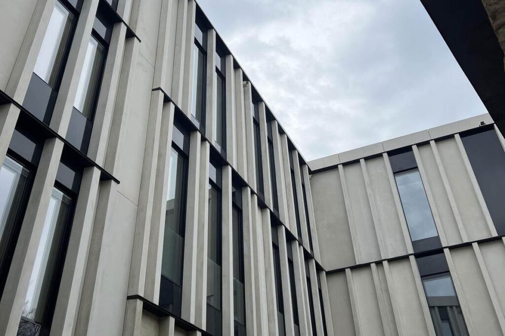 Innerstädtische Baumaßnahme: Anlieferungen und Montagen Just in time, sehr beengtes Baufeld mit nahezu keinen Lagerplatz, Gründungsbauteile und Untergeschoss in WU-Bauweise mit FBVF, komplexe Gebäudegeometrie, Sichtbetonwände und Decken in Sichtbetonklasse 4 (Ausführung Herbst/Winter/Frühjahr/Sommer), Grenzbebauung an bestehenden Gebäudekomplexen, auskragende Stahlbetondecken mit Planung und Erstellung der Traggerüste, Spachtelarbeiten aller Treppenhäusern in Q3