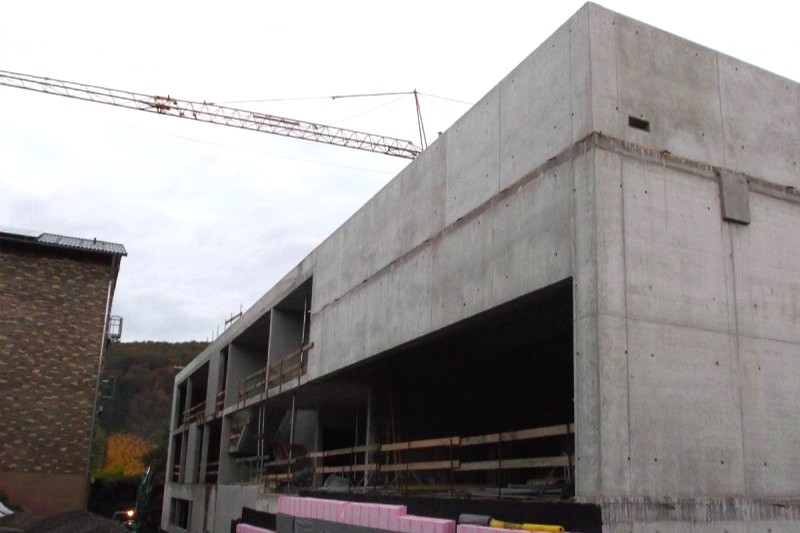 Erstellung eines dreigeschossigen Neubau für die Duale Hochschule in Mosbach. Der Rohbau ist als Stahlbeton-Skelettkonstruktion konzipiert. Die Flachdecken liegen auf aussteifenden Außen- und Innenwänden sowie schlanken Stahlkernverbundstützen. Bodenverbesserung durch ca. 8 m tiefen Rüttelstopfsäulen, die darauf lagernde, 50 cm dicke Bodenplatte wird in WU-Beton ausgeführt. Die tragenden Wände im UG, Brüstungen, Unterzüge, Decken und Attika werden als Ortbeton, teilweise in SB 3, die tragenden Wände im EG und OG werden als Halbfertigteile in Sichtbetonqualität ausgeführt.