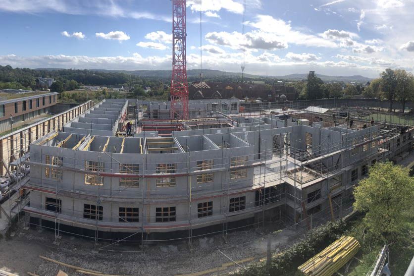 Halbfertigteilwände, Frischbetonverbundfolie, Bauen während laufendem Betrieb im Nebengebäude